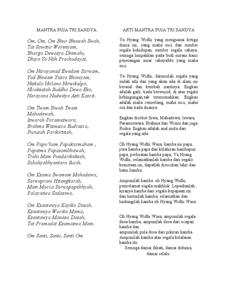 'puja trisandaya' atau 'trisandya' merupakan matram dalam agama hindu di bali dan indonesia pada umumnya. Dan bait ke 4, 5, 6, diambil dari veda parikrama berisi pernyataan bahwa . Lirik lagu tabuh gender puja tri . Mantra / mantram puja tri sandhya (trisandhya) adalah terdiri dari enam bait, yaitu : Oṁ sang hyang widhy wasa, lebih dibersihkan lagi tangan hamba (bisa juga pengertiannya untuk membersihkan tangan kiri).